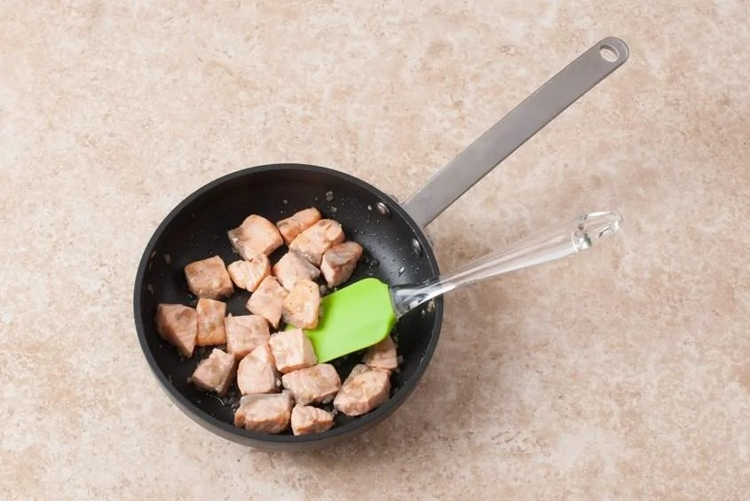 ШАГ 4 На оливковом масле обжарьте лук и чеснок, добавьте лосось и обжаривайте еще 2–3 минуты.