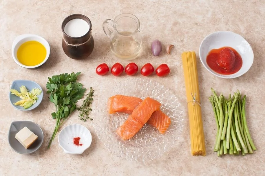 Ингредиенты для приготовления Спагетти с лососем и спаржей в сливочном соусе: