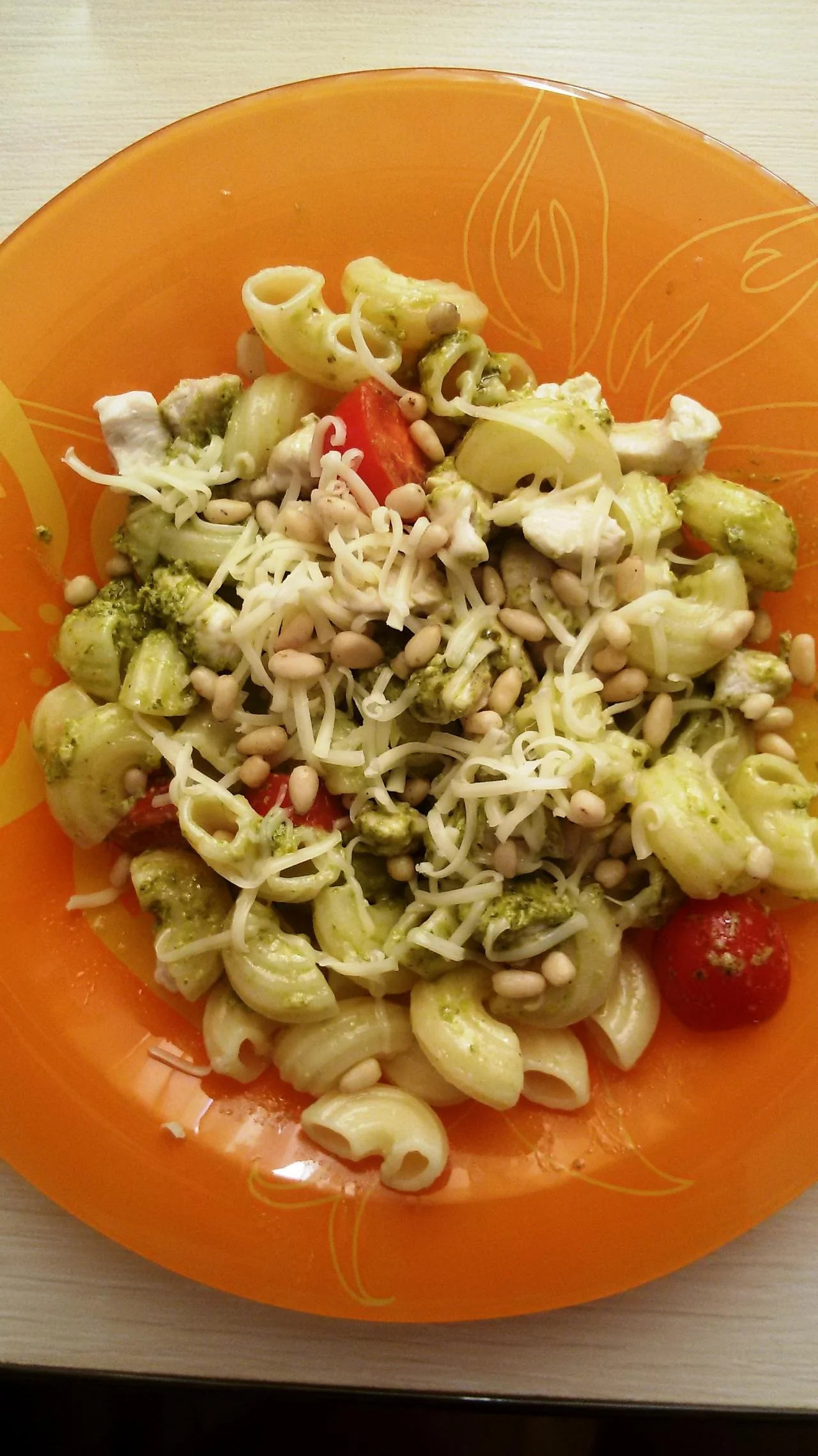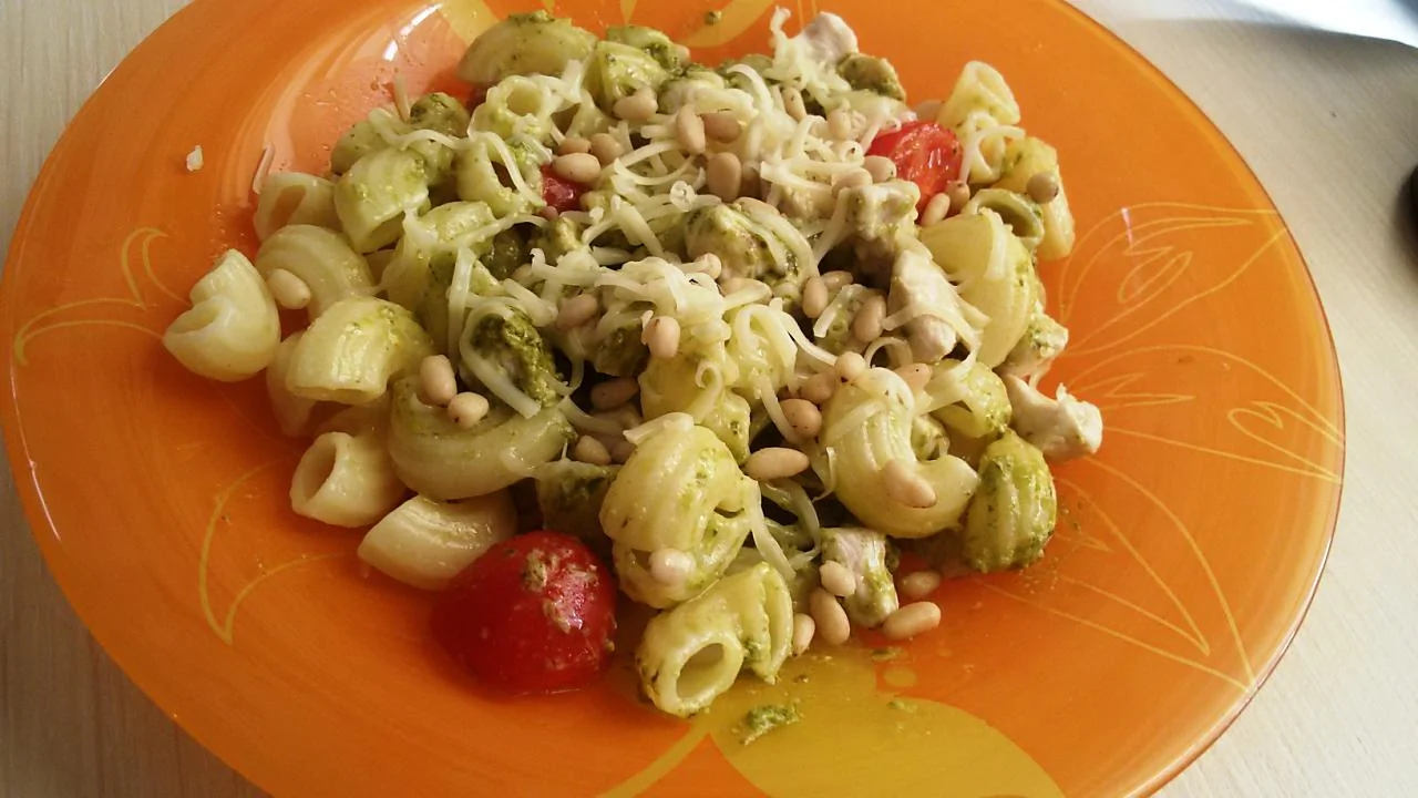 Паста с курицей, соусом песто и кедровыми орешками