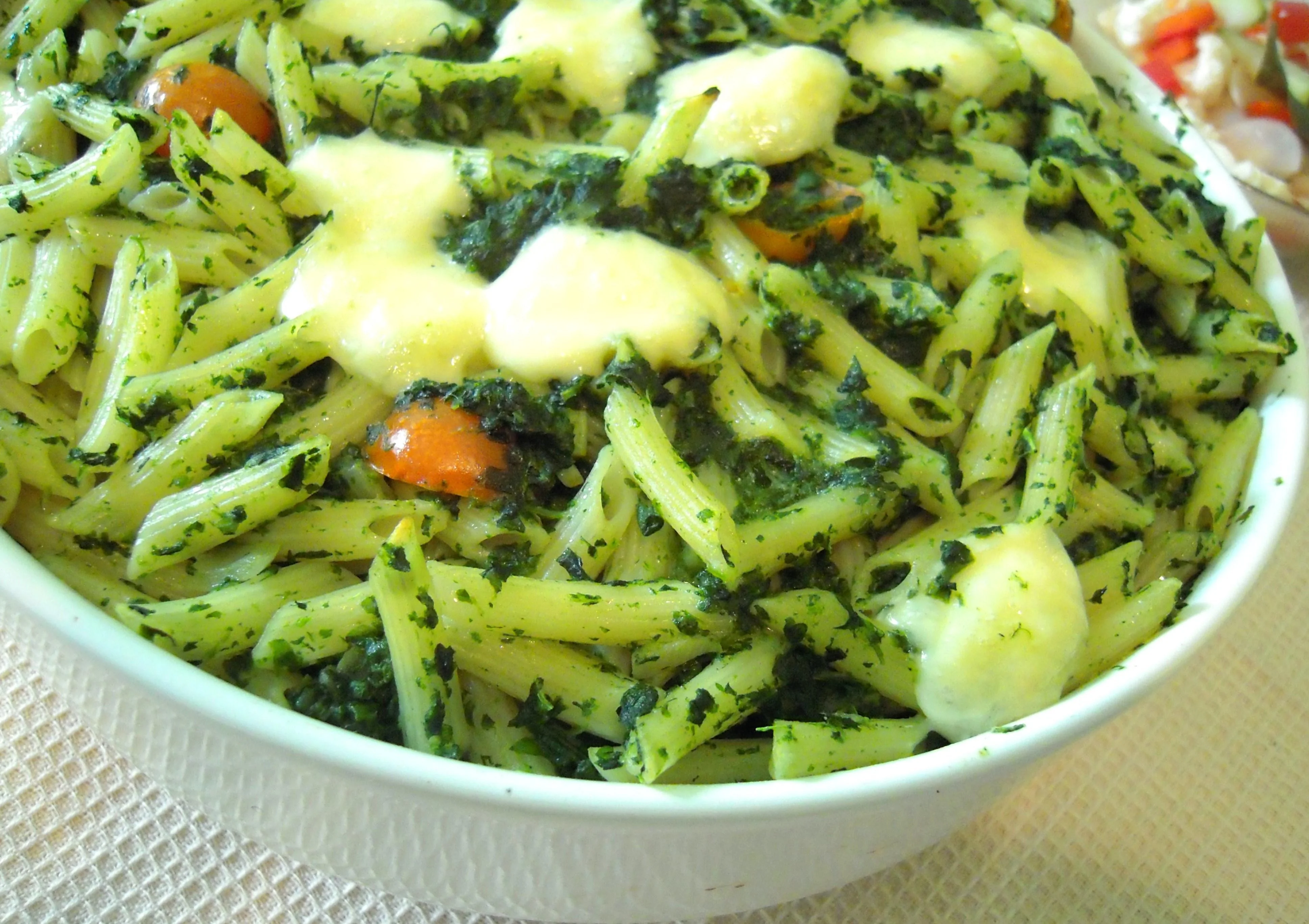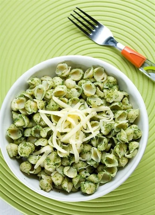 ШАГ 5 Смешайте макарони с половиной тертого сыра и выложите эту смесь на шпинат. Сверху залейте соусом-бешамель. Посыпьте оставшимся сыром и выложите кусочки оставшегося сливочного масла.