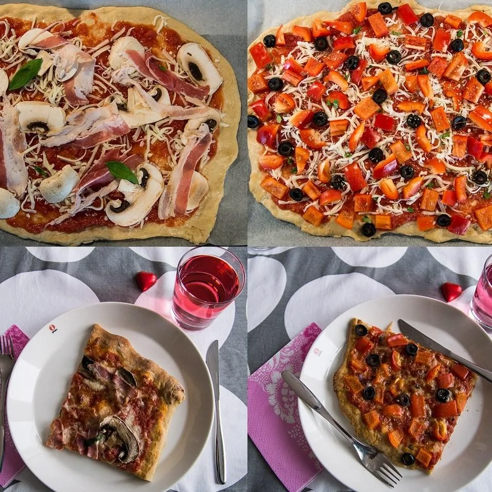 грибами и прошутто, или с тунцом и оливками), украсить листьями базилика.