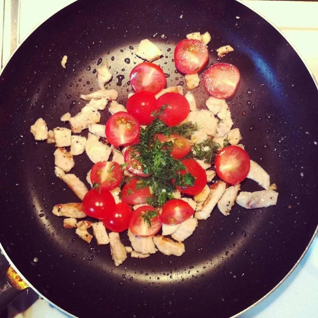 ШАГ 2 Помидоры нарезать на половинки, укроп покрошить. Добавить к курице и потушить вместе 3–5 минут.
