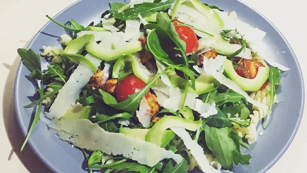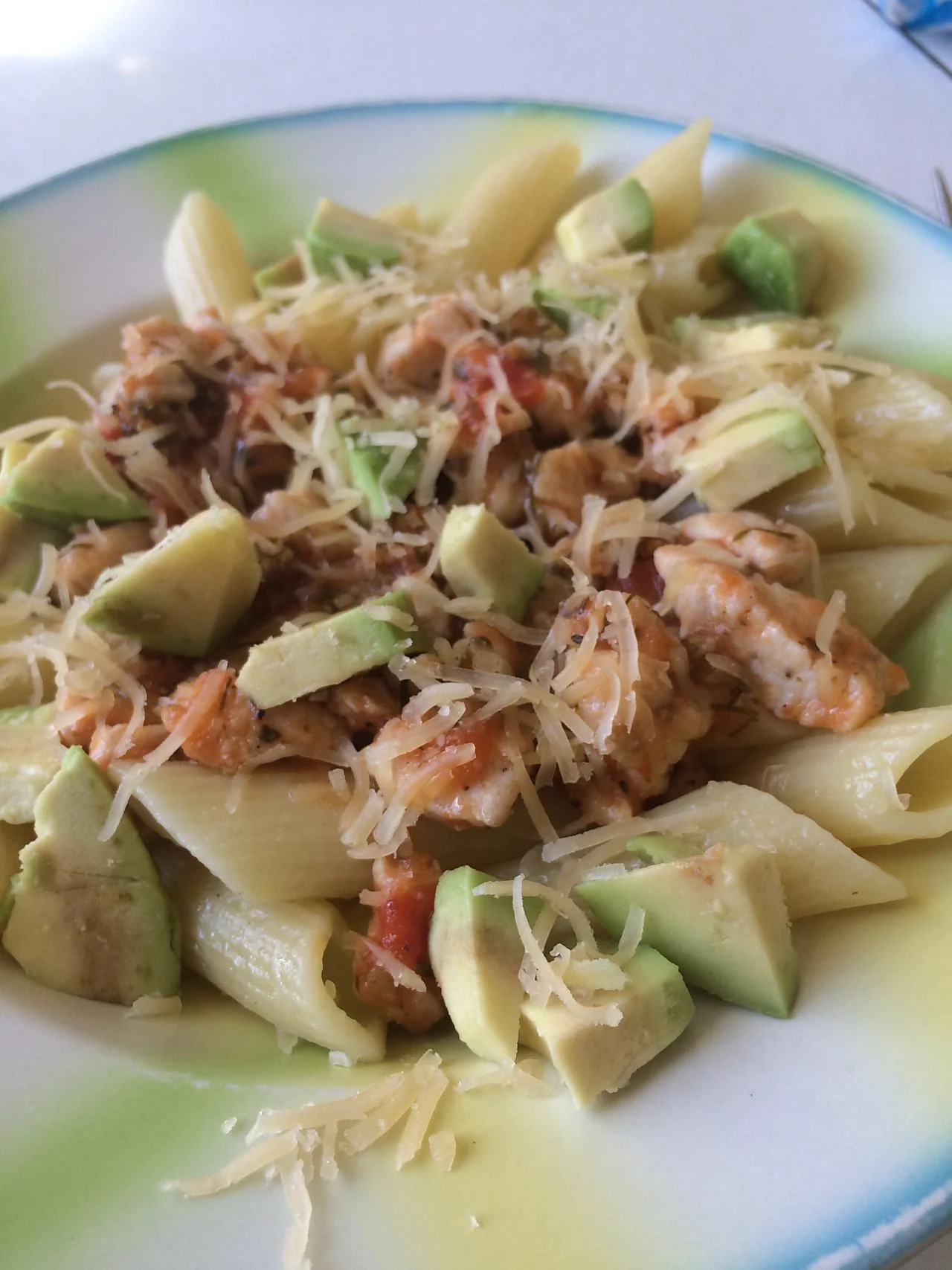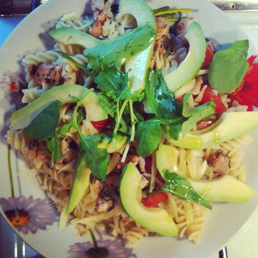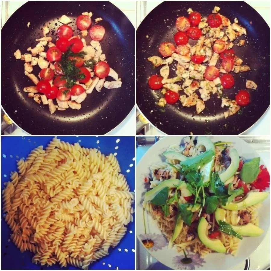 Паста с курицей, помидорами и авокадо