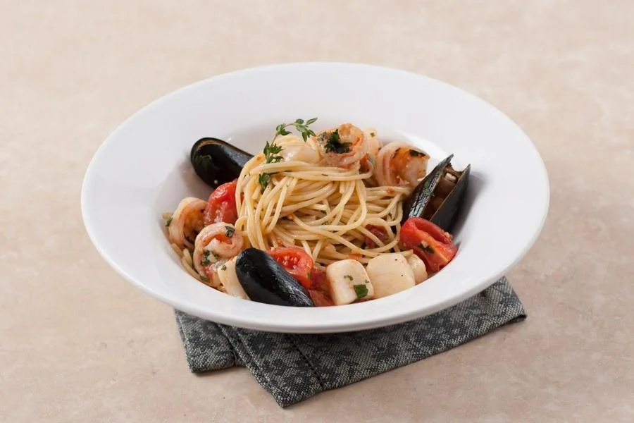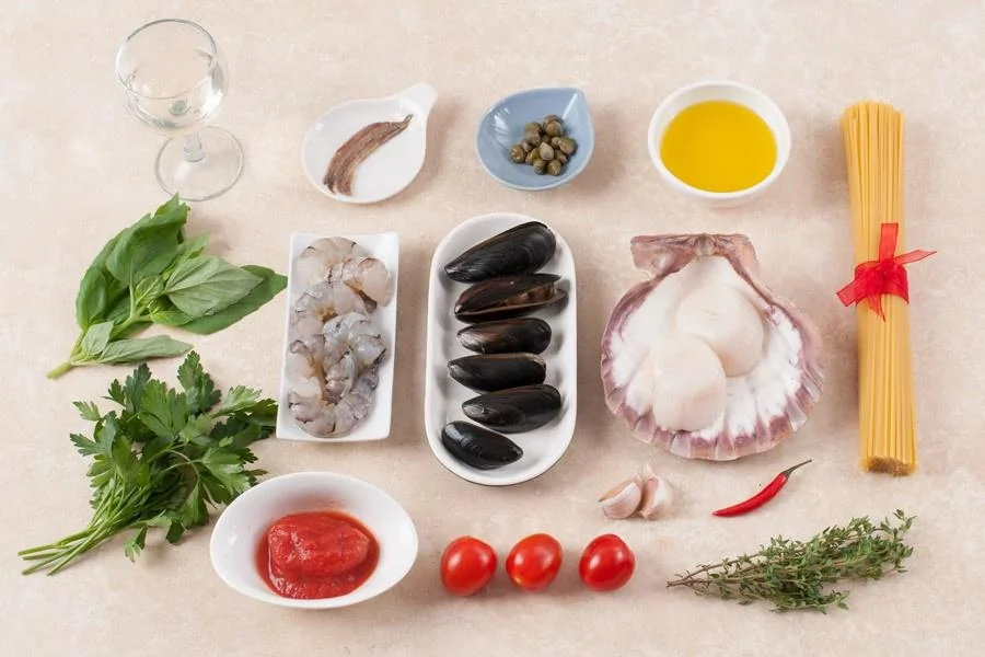 ШАГ 5 Добавьте томаты в собственном соку, креветки, морские гребешки, каперсы, помидоры черри, чили перец, зелень петрушки и базилика, обжаривайте помешивая в течение 30 секунд.