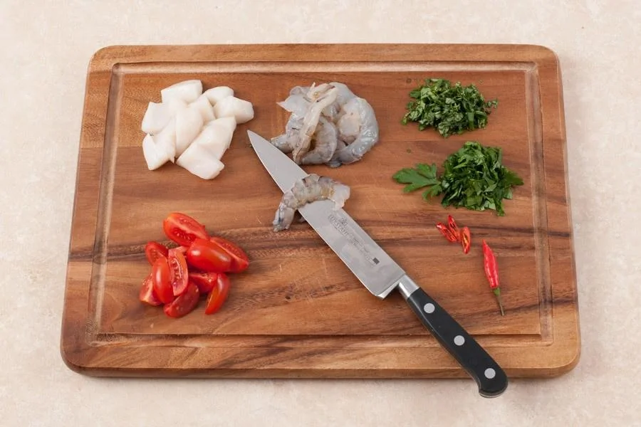 ШАГ 2 Разрежьте тигровые креветки вдоль, морские гребешки нарежьте кубиком 1,5х1,5 см, разрежьте помидоры черри на 4 части, отрежьте 3 тонкие пластинки чили перца, мелко нарубите зелень петрушки и базилика.