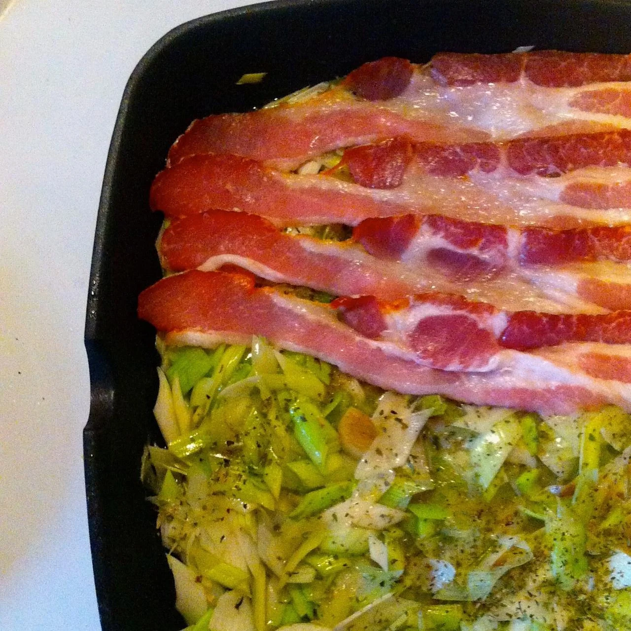 ШАГ 3 Выложить поверх лука прошутто, аккуратно, чтобы покрывалась вся площадь. Оставить готовиться на медленном огне в течение 30 минут.