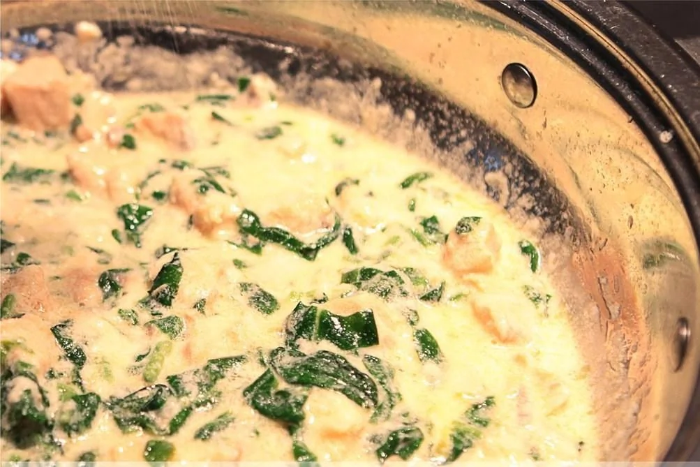 ШАГ 3 Добавьте специи (соль, перец, орегано) и сливки, тушите до загустения сливок (минут 10). Приправьте мускатным орехом и кидайте мелко нарезанный шпинат.
