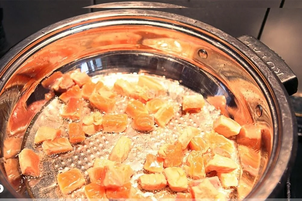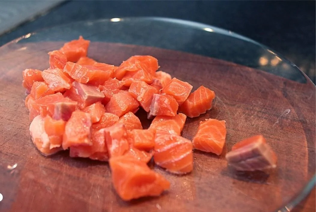 ШАГ 1 Промойте рыбу, удалите кожу и кости, сбрызните лимонным соком и нарежьте кубиками.