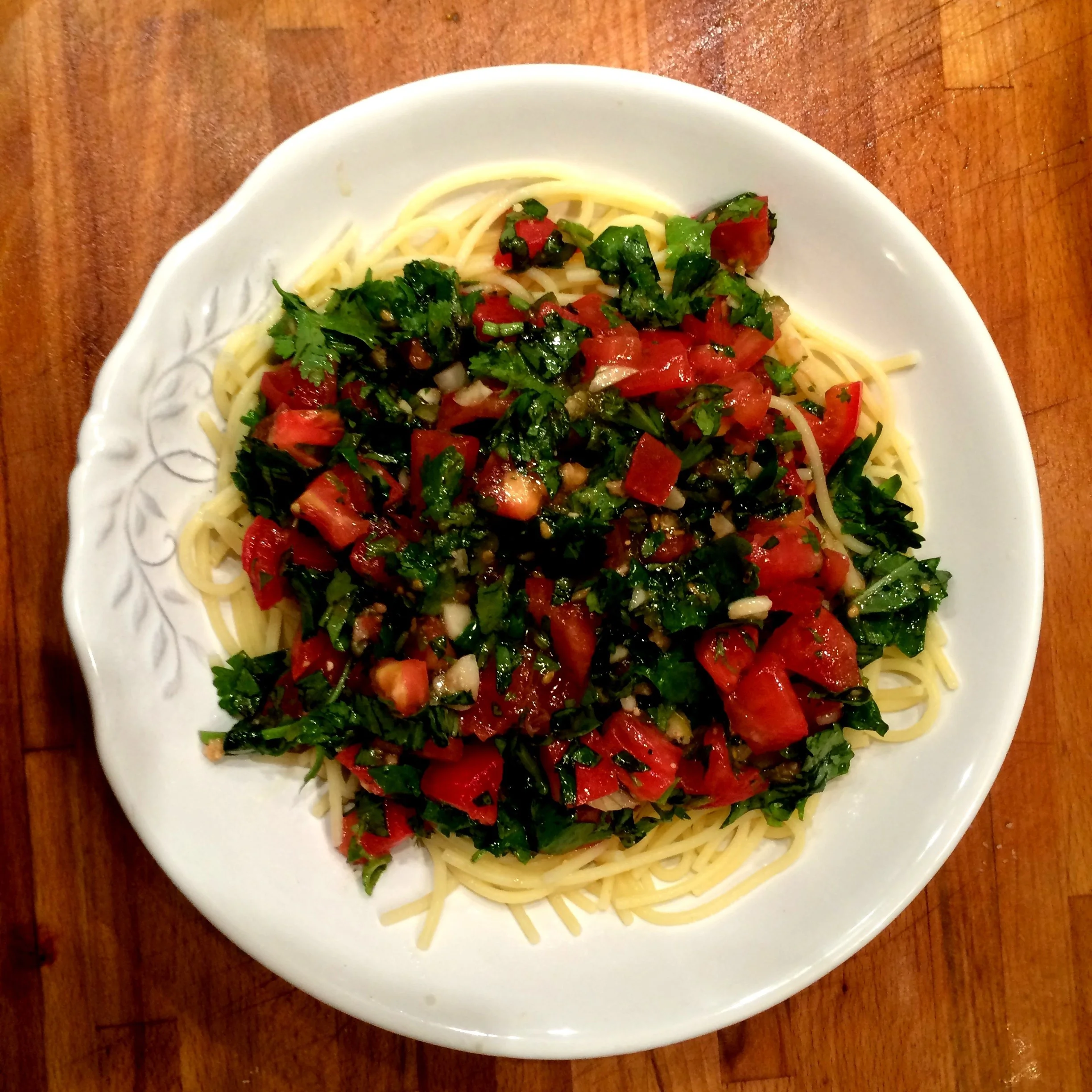 ШАГ 13 Сразу сверху на лингвини выложите помидорную заправку — это не даст лингвини слипнуться.