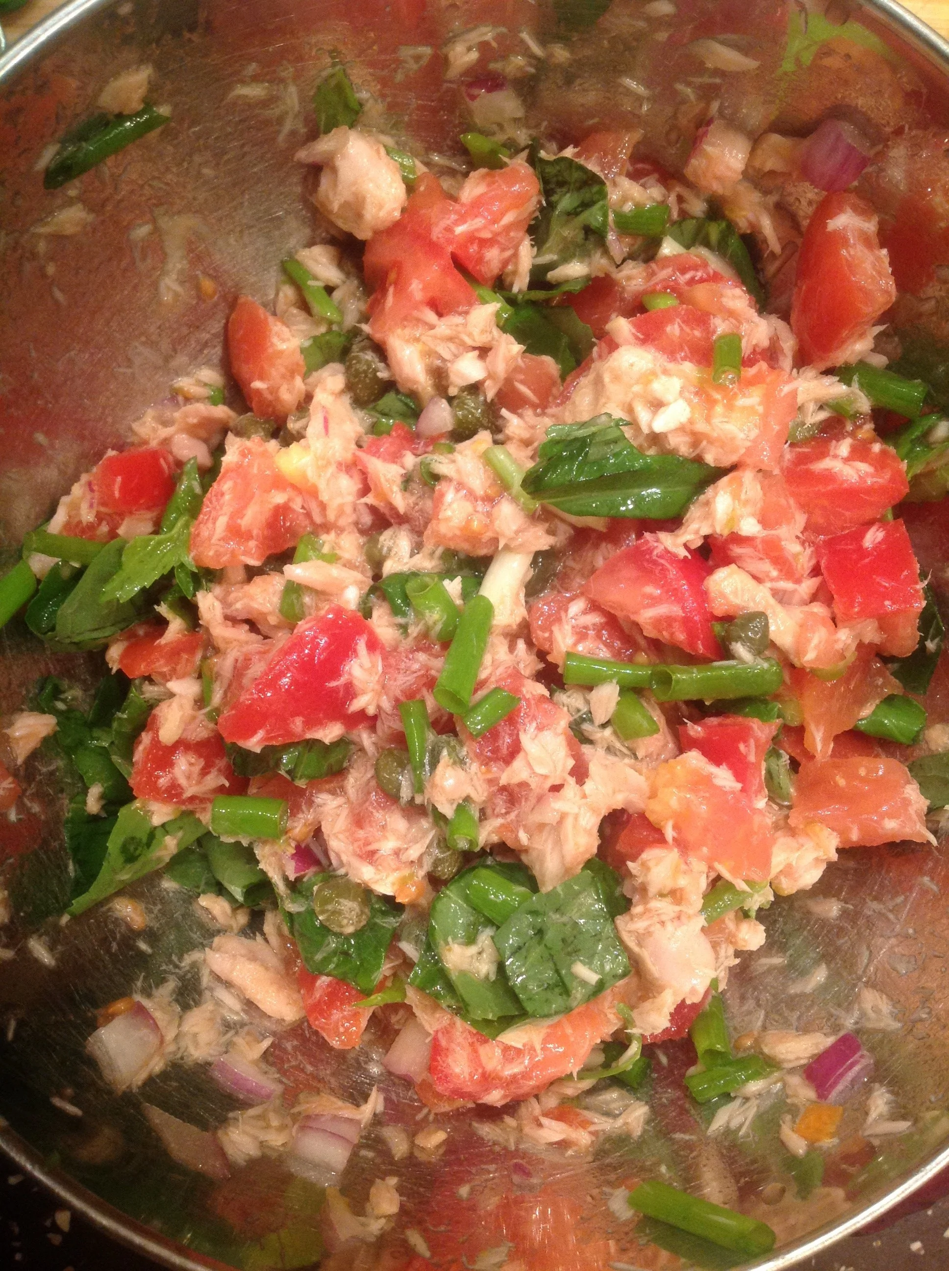 ШАГ 6 Слейте масло из банки с тунцом и крупно поломайте его руками в помидорную смесь. Посолите и поперчите по вкусу и аккуратно перемешайте.
