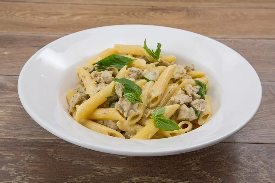 ШАГ 7 Разложите пенне в тарелки, поперчите, присыпьте крупно порубленным базиликом и подавайте.