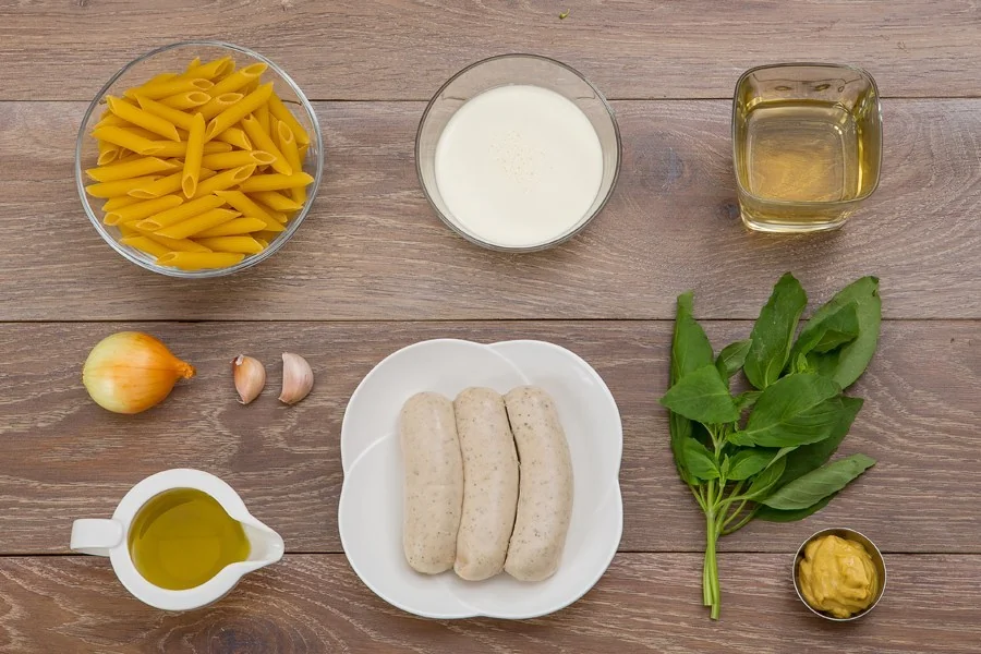 Ингредиенты для приготовления Пенне с колбасками и горчицей:
