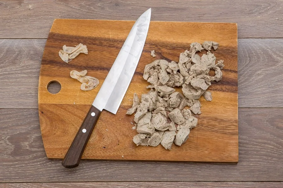 ШАГ 2 С колбасок снимите оболочку и раздавите ножом.