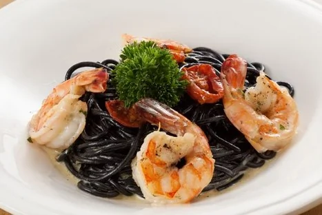 ШАГ 5 Полученный соус перемешать с отваренными черными спагетти (100 г) и выложить на тарелку.
