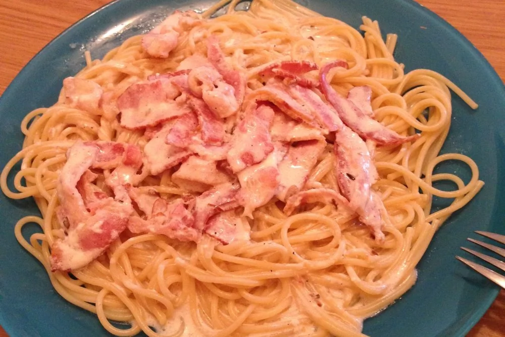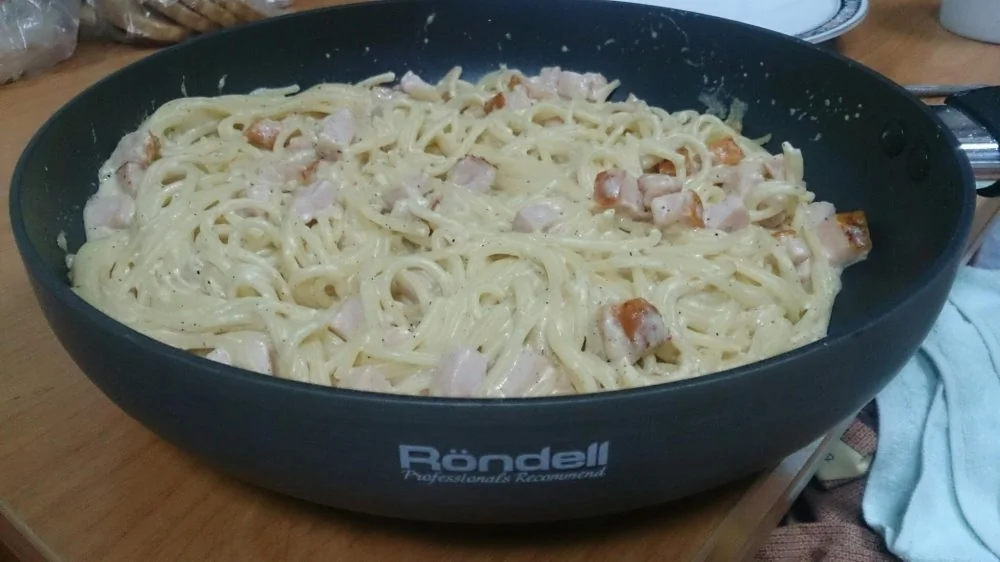 ШАГ 4 Выложите на тарелку спагетти и полейте соусом. Можно украсить зеленью.