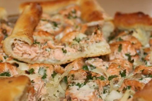 ШАГ 5 Следующим слоем уложить рыбу, сверху положить лук, нарезанный полукольцами.