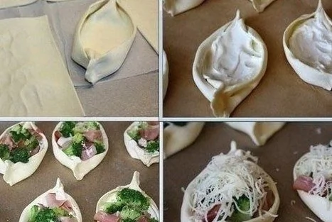ШАГ 3 Тесто разрезать на 8 частей. Каждую часть в серединке немного прижать/расплющить пальцами. Края защипнуть, получатся небольшие лодочки. Выложить их на противень с пекарской бумагой. Каждую лодочку внутри смазать сметаной. Поверх выложить брокколи с беконом (и луком). Посыпать тертым сыром. Брокколи я не солила, так как и сыр и бекон уже достаточно соленые.