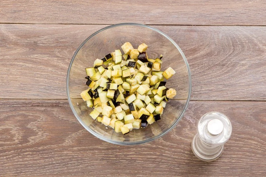 ШАГ 2 Нарежьте баклажан средним кубиком, присыпьте солью и оставьте на несколько минут, чтобы ушла горечь.
