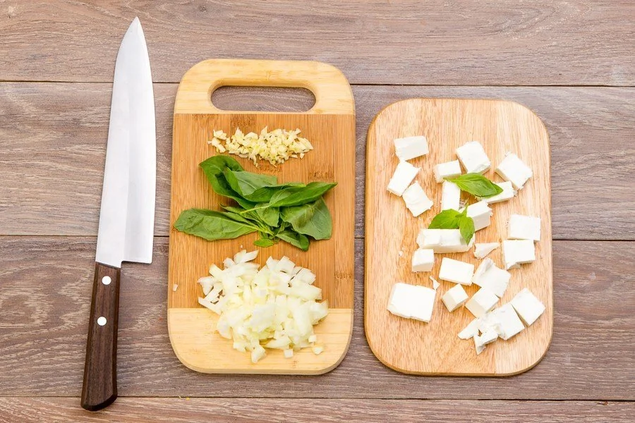 ШАГ 3 Очистите лук, раздавите и очистите чеснок, порубите лук и чеснок мелко; отделите листья базилика от стебля (несколько листьев оставьте для украшения); нарежьте фету кубиком, смачивая нож водой.