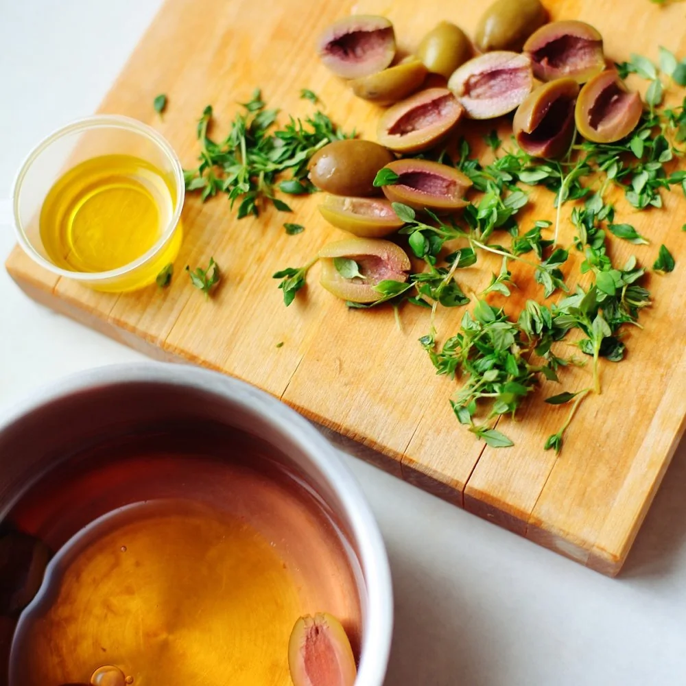 ШАГ 3 Пока варится лазанья, приготовьте заправку: разрежьте оливки пополам, оборвите листья тимьяна с веточек. В ковшике смешайте бальзамический уксус, оливковое масло, маслины и тимьян, нагрейте на среднем огне, уберите в сторону.