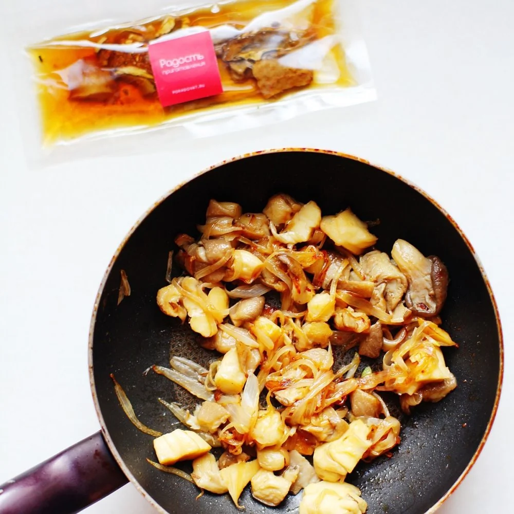 ШАГ 4 Приготовьте начинку: почистите и тонко нарежьте лук-шалот, на среднем огне нагрейте сливочное масло. На нем обжарьте лук до мягкости, затем добавьте шампиньоны. Когда грибы ужарятся примерно в два раза, добавьте белые грибы вместе с их «бульоном». Посолите по вкусу, снимите с огня.