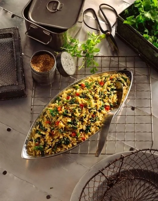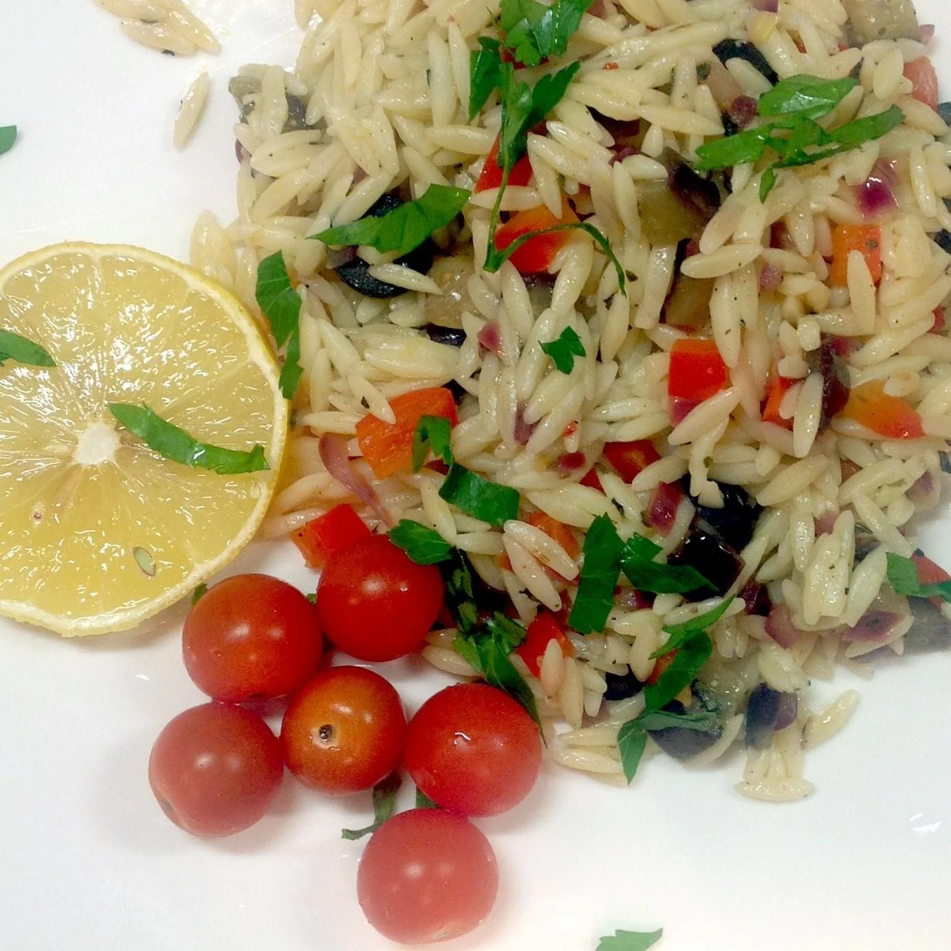 ШАГ 1 Отварить пасту орзо, слить и отставить. В большой сковороде разогреть масло, добавить баклажан, лук и перец и обжаривать 7–8 минут. Добавить цедру и сок лимона.