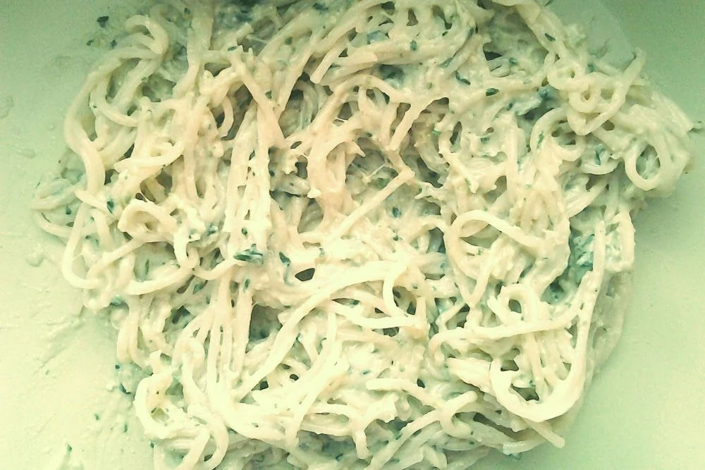ШАГ 5 Песто выложить на пасту, перемешать.