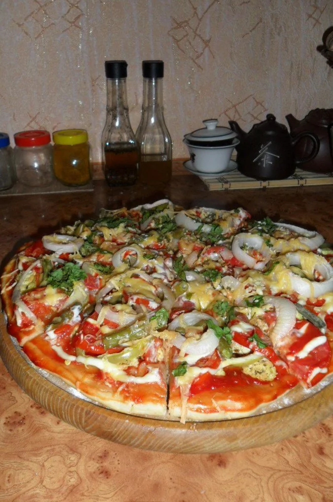 ШАГ 5 На лепешку выложить колбасу, фасоль, помидоры, лук и оливки. Полить сверху майонезом и кетчупом. Посыпать сыром и отправить снова в духовку на 15–20 минут.