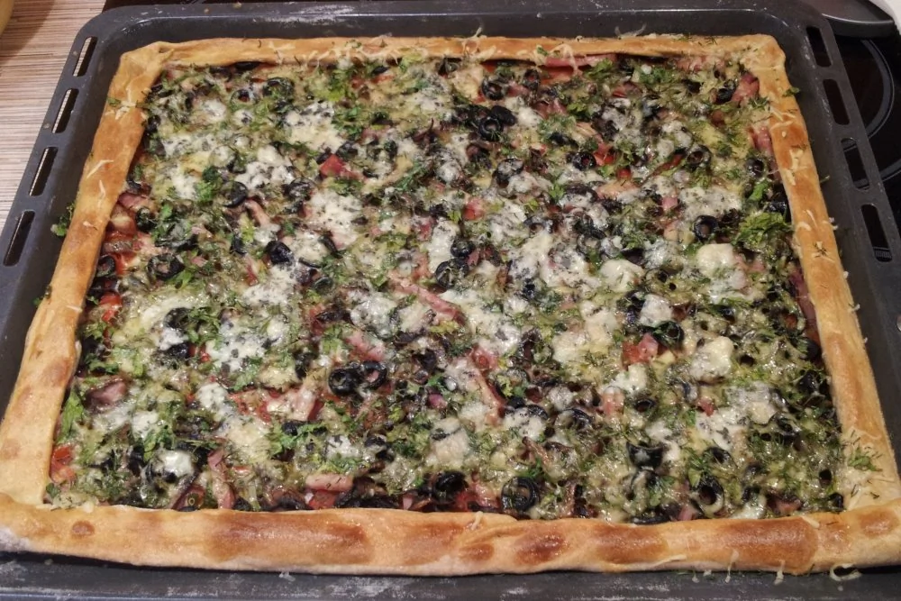 ШАГ 9 Поставить противень с пиццей в предварительно разогретую до 200 градусов духовку на 15 минут.