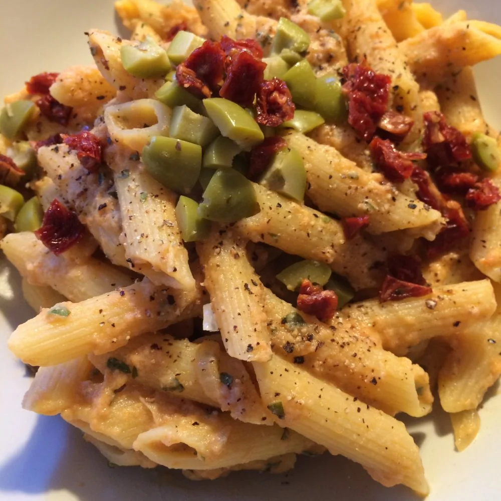 ШАГ 6 Разложить пасту по тарелкам, украсив свежесмолотым перцем, оливками и вялеными томатами.