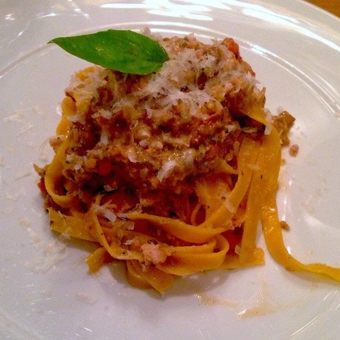ШАГ 5 Выкладываем приготовленное филе кролика с лисичками, сверху на тальятелле, посыпаем тертым пармезаном и украшаем листиком базилика.