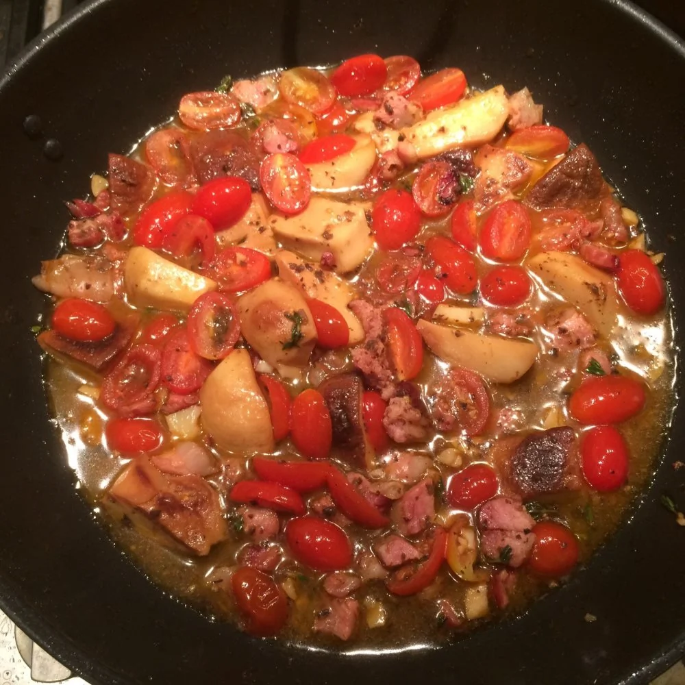ШАГ 5 Добавьте нарезанные на половинки помидоры черри, мясо, чеснок и половину листьев тимьяна, уменьшите огонь и обжаривайте на среднем огне, помешивая, около 3 минут, затем добавьте белое сухое вино белое.