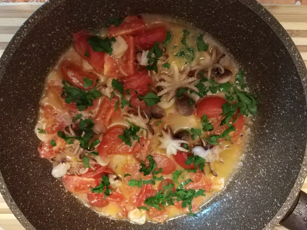ШАГ 5 Разогреваем оливковое масло в большой сотейнике и бросаем туда осьминогов. Обжариваем на сильном огне 2–3 минуты, после чего уменьшаем огонь до среднего бросаем чеснок, обжариваем еще 1 минуту до появления запаха и вливаем вино и кладем помидоры.