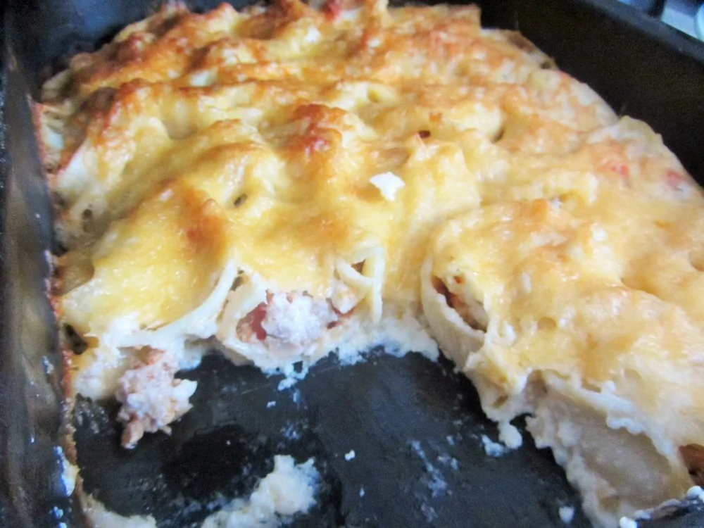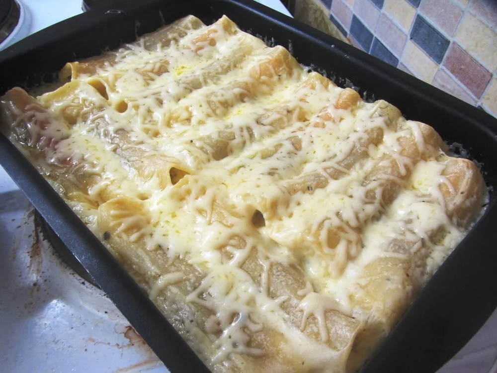 ШАГ 11 Сверху полить каннеллони соусом бешамель и поставить в духовку на 35–40 минут. Температура 160–180 градусов. (Я за 10 минут до готовности дополнительно еще сверху тертым сыром посыпаю).