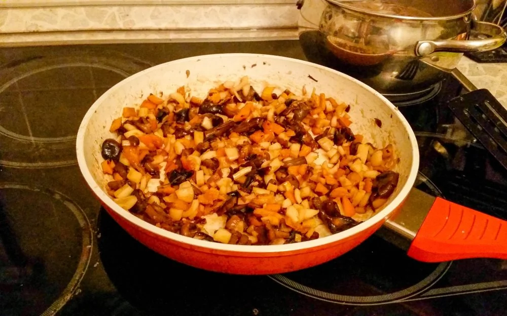 ШАГ 5 Когда грибы готовы, высыпаем все нашинкованное в сковороду и перемешиваем с грибами. Наливаем туда соевый соус, растительное масло, солим по вкусу и обжариваем всю эту красоту до готовности на огне выше среднего (кальмары должны приготовиться в соке грибов, а сок с грибов от температуры должен испариться, в общем, на последних минутах жидкости уже почти быть не должно, блюдо должно уже жариться, а не тушиться).
