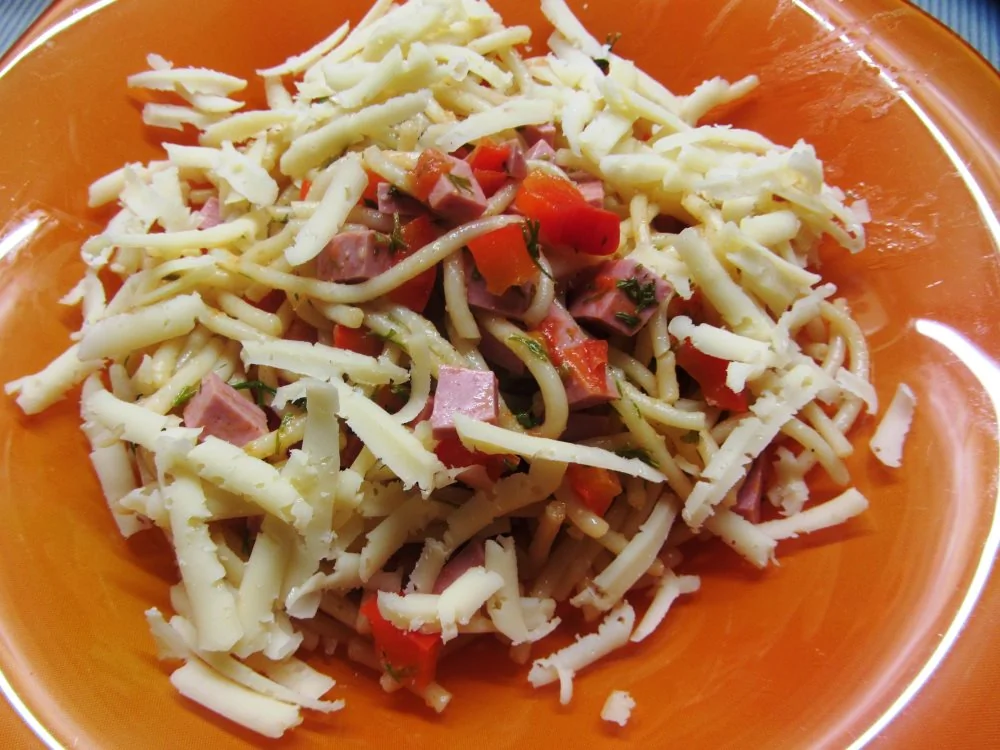 ШАГ 4 Подавать спагетти, полив сверху овощами с ветчиной и посыпав натертым сыром.