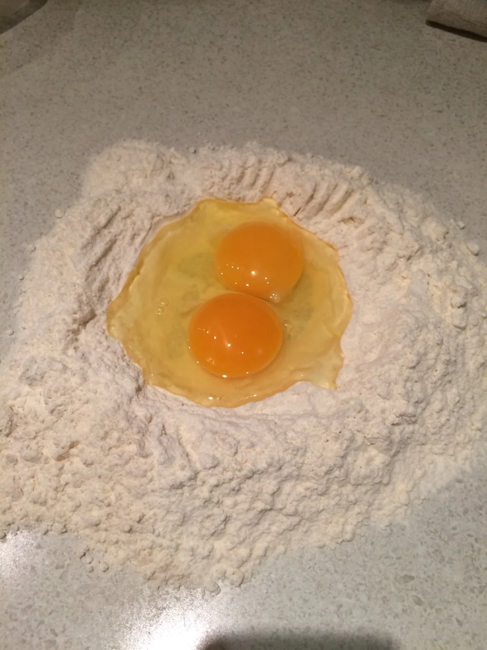 ШАГ 1 муку просеиваем через сито на стол, делаем в муке углубление и разбиваем в это углубление яйца ( на 100гр муки 1 яйцо)