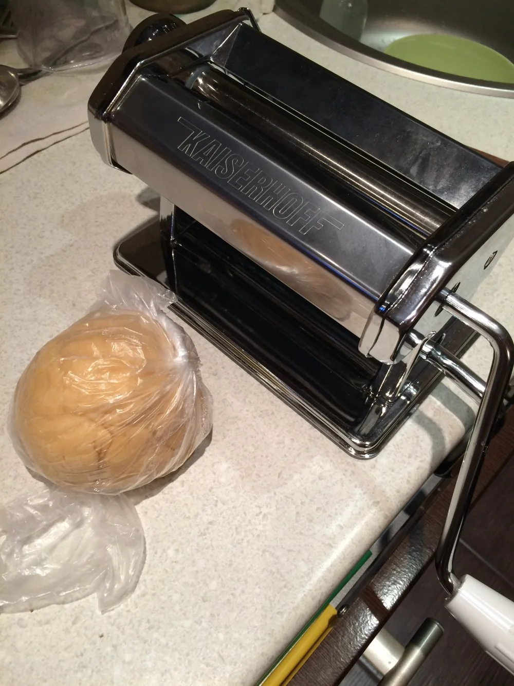 ШАГ 5 раскатываем тесто в ручную или на машинке, и формируем по своему желанию. (на фото я работал с лапшерезкой и делал тонкую лапшу)