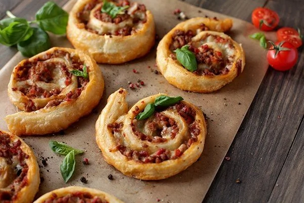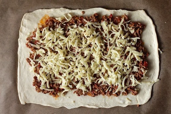 ШАГ 4 Застелите большой противень бумагой для выпечки, смажьте маслом,раскатайте тесто в тонкие пласты. Смажьте их по всей поверхности соусом, посыпьте моцареллой и аккуратно сверните каждый пласт рулетом.