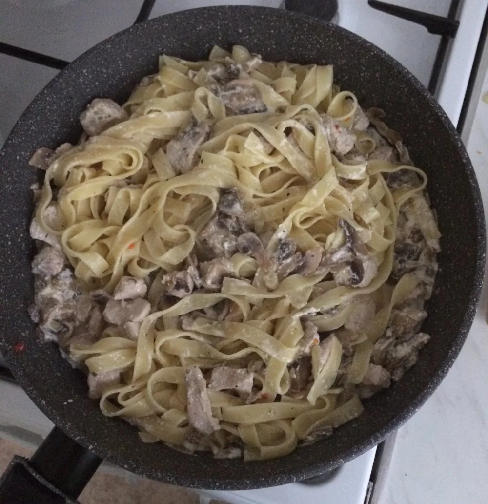 ШАГ 9 В готовый соус выложить приготовленную пасту, перемешать спагетти с грибами и курицей.