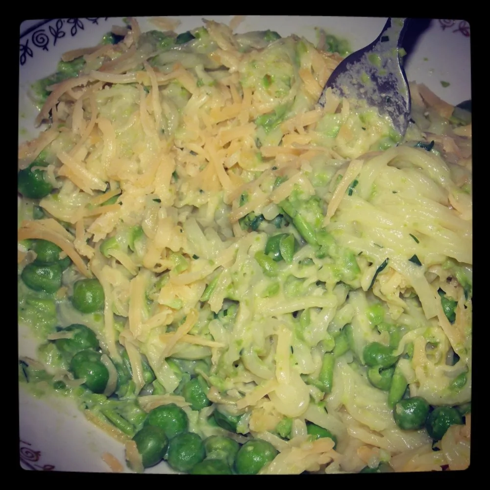 ШАГ 1 Варите пасту (у меня была лапша яичная Роллтон) в подслененной кипящей воде 8-10 минут до мягкости. За 2 минуты до готовности добавьте треть горошка. Отвар сохраните.