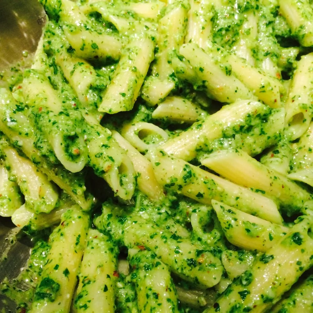 Пенне с песто из базилика и рукколы с фундуком