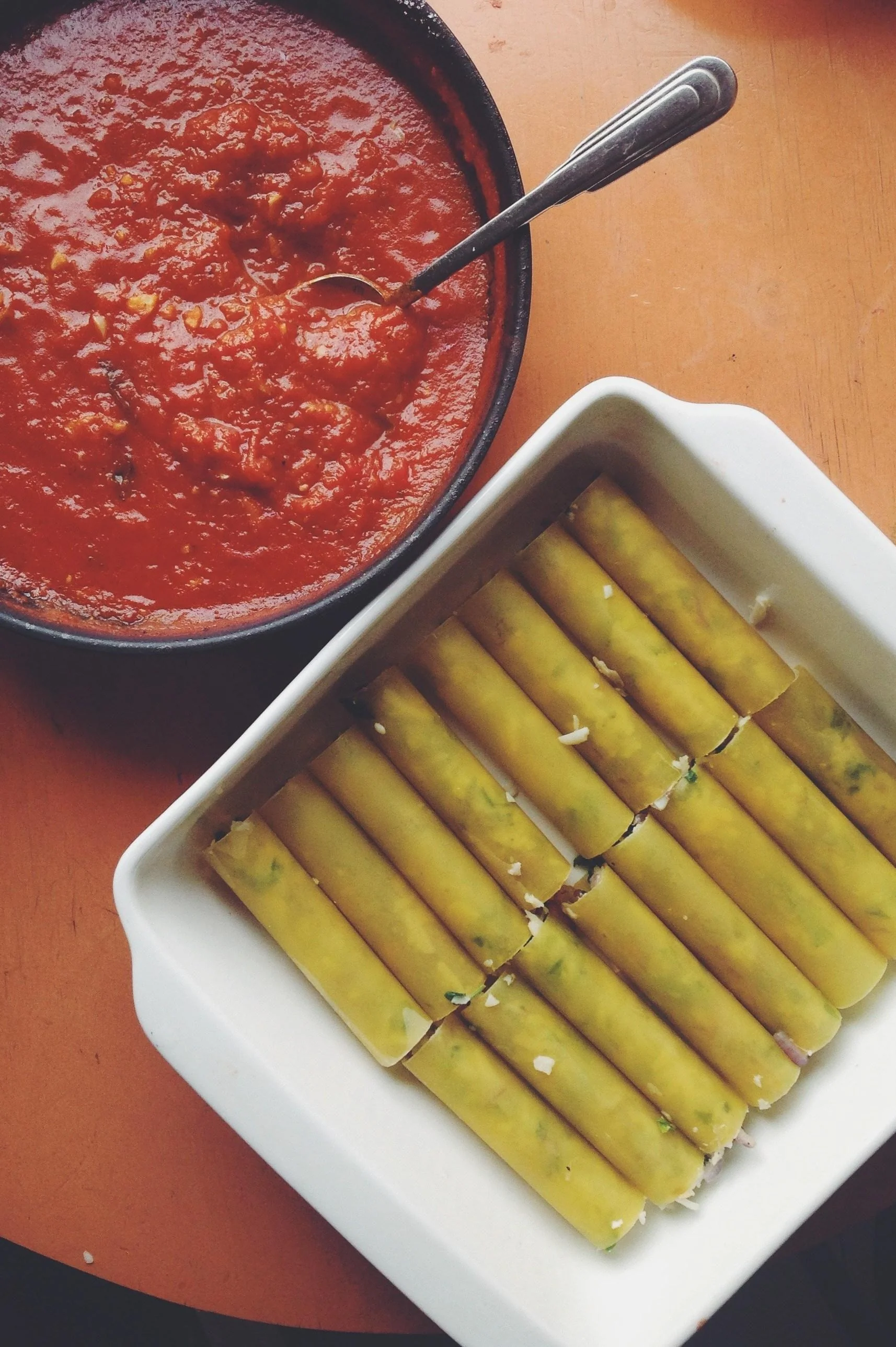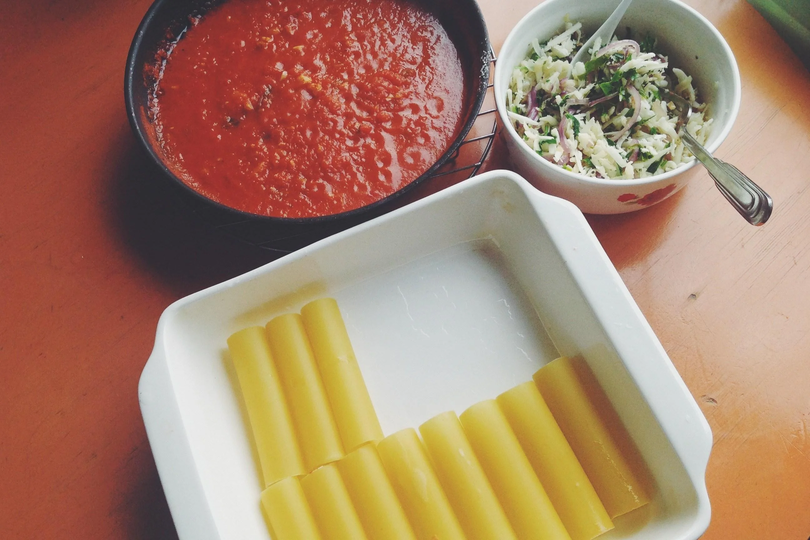 ШАГ 4 Сварите каннеллони до состояния аль денте, слейте воду и промойте холодной водой. Нафаршируйте каждую трубочку смесью сыра, лука и зелени. Выложите в форму, залейте соусом из помидоров и чеснока. Посыпьте пармезаном и поставьте в разогретую духовку на двадцать минут.