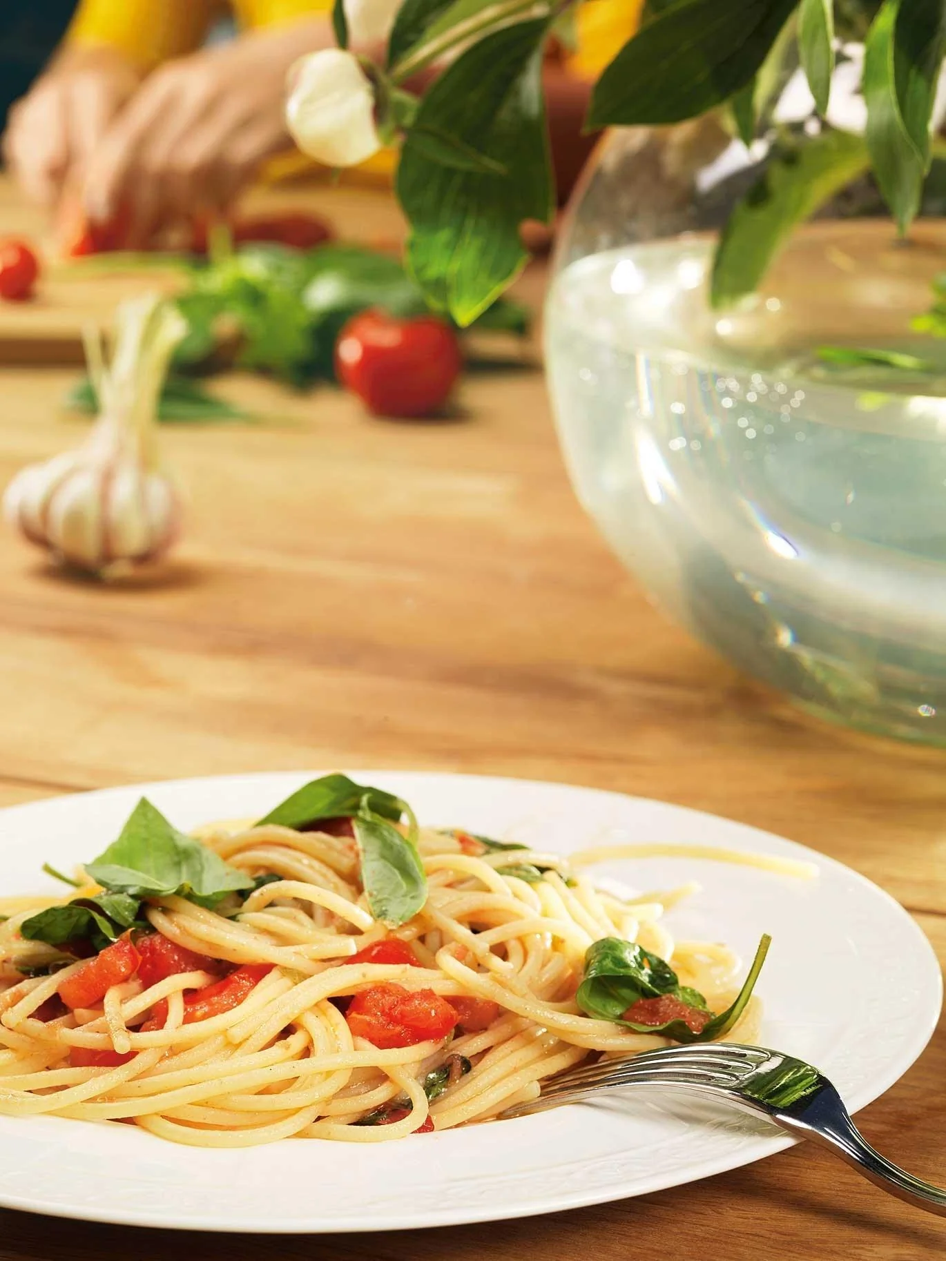 ШАГ 1 Положите все ингредиенты, кроме спагетти и базилика, в сотейник, залейте тремя ложками оливкового масла — это примерно 70 грамм, перемешайте, но не подогревайте. Попробуйте, посолите и поперчите.