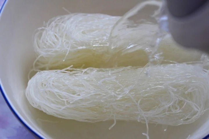 ШАГ 7 Рисовую лапшу залить на 3 минуты кипятком (или как указано на упаковке).