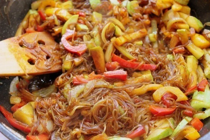 ШАГ 8 К овощам добавить фунчозу, соус, молотый перец и перемешать.