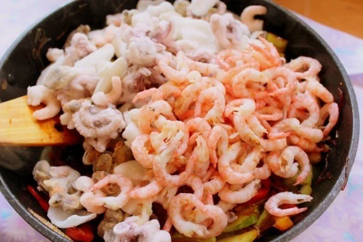 ШАГ 9 Добавить морской коктейль, не размораживая его, и креветки, убавить огонь и томить минут 7–10.