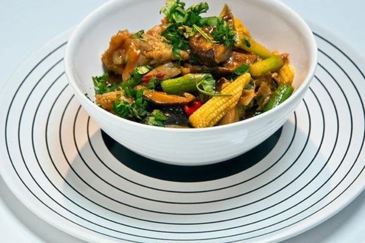 ШАГ 5 Разогреваем глубокую сковороду с добавлением растительного масла. Помещаем чеснок, имбирь и перец чили. Добавляем спаржу, кукурузу и грибы шиитаке. Добавляем сахар и белый перец. Перемешиваем. Растворяем крахмал в воде. Помещаем свинину в сковороду, когда овощи слегка обжарятся. Добавляем соевый соус, устричный соус, крахмал и кунжутное масло. Обжариваем до готовности.