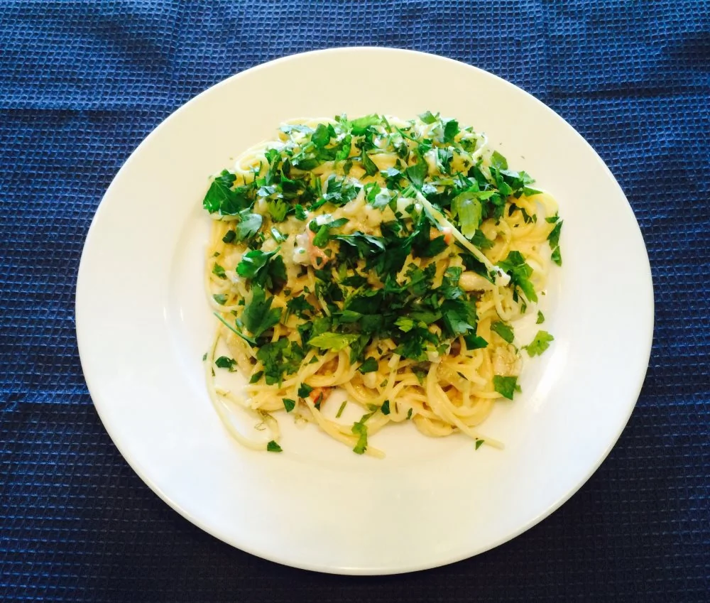 Спагетти с треской и копченым лососем
