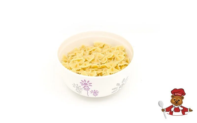 ШАГ 2 Всыпьте в кипящую воду макаронные изделия и отварите их (время указано на упаковке). Слейте воду и переложите отваренные бантики в глубокую миску.